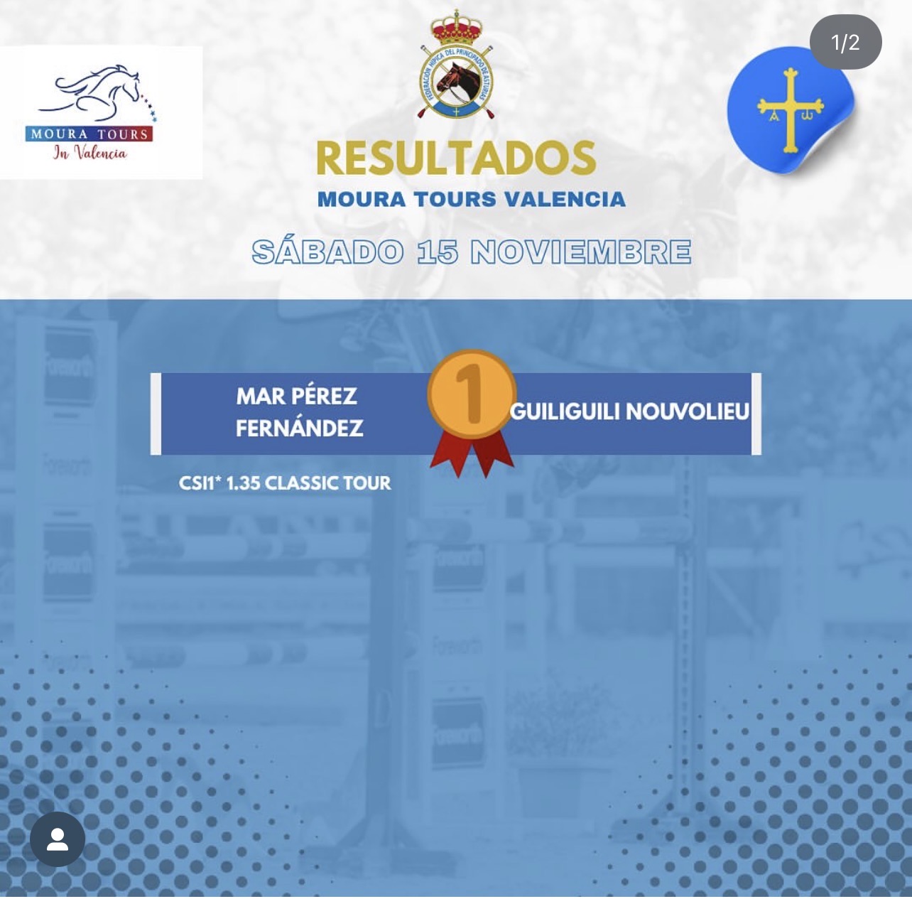 En el Moura Tours Valencia, nuestra amazona Mar Pérez Fernández logró dos brillantes victorias, el sábado 15 de noviembre imponiéndose en el CSI1* 1.35 Classic Tour junto a Guiliguili Nouvolieu y el domingo 16 con este mismo caballo en la prueba CSI1* 1.30m.