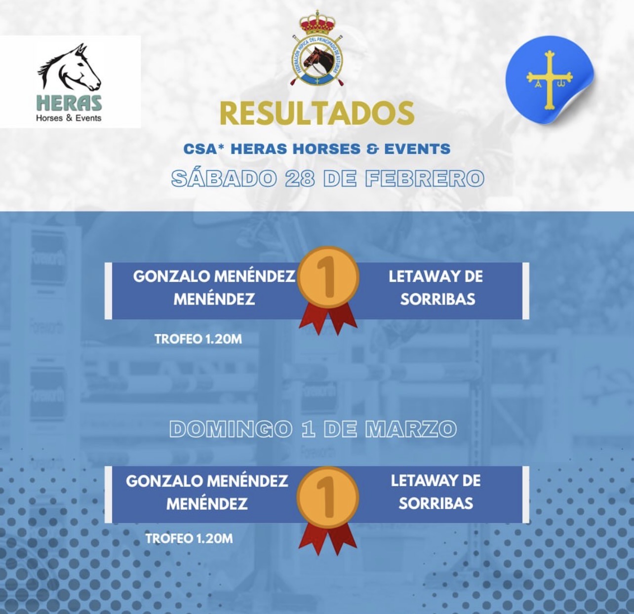 💡Heras Horses & Events es siempre un destino escogido por los Asturianos para las competiciones cántabras. Durante este fin de semana se disputó el CSA* Heras Horses & Events al que acudieron algunos de nuestros binomios más destacados en competición, entre ellos el jinete Gonzalo Menéndez Menéndez junto a Letaway de Sorribas.
