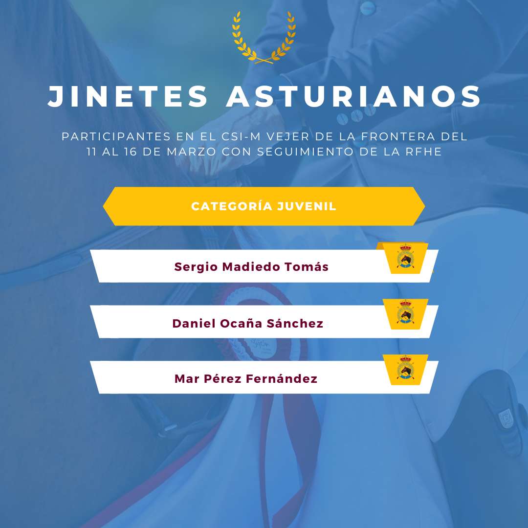 🏁Los siguientes jinetes y amazonas asturianos han sido seleccionados para realizar un seguimiento de su competición por la Real Federación Hípica Española durante los días 11-16 de Marzo en el CSI* Vejer de la Frontera.